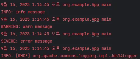 가장 먼저 Commos Logging만 추가하고 실행해 보았을 때는 JUL(Java 기본 로거)이 구현체로 선택되는 것을 확인할 수 있었다.