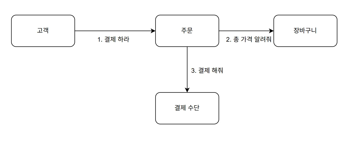 주문 목록을 가장 잘 알고 있는 객체는 장바구니 객체다. 주문 객체는 장바구니 객체에게 주문 목록들에 대한 총가격을 요청해야 한다. 총가격을 얻은 뒤에는 결제 수단을 바탕으로 결제를 진행해야 한다. 그 도메인 모델을 그러보면 아래와 같다.