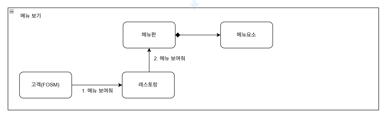 요구사항을 보면 주문 로직과 결제로직 이외에도 메뉴판을 보여주는 로직도 존재한다. 해당 요구사항의 경우 이미 만들어진 도메인 모델에 책임만 할당하면 해결이 되어서 아래와 같이 바로 도메인 모델을 만들 수 있었고 구현 같은 경우도 어렵지 않게 진행할 수 있었습니다.
