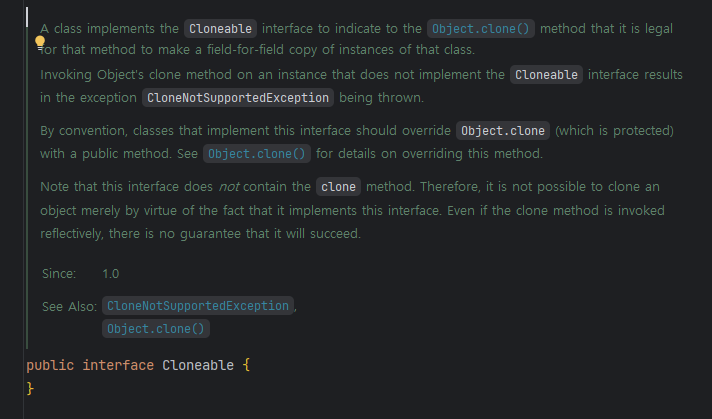 실제로 Object의 clone()에 적혀있는 문서 내용에는 아래와 같이 적혀있다. 해석해 보면 Cloneable 인터페이스를 지원하지 않는다면 CloneNotSupportedException을 던진다고 나와있다.
