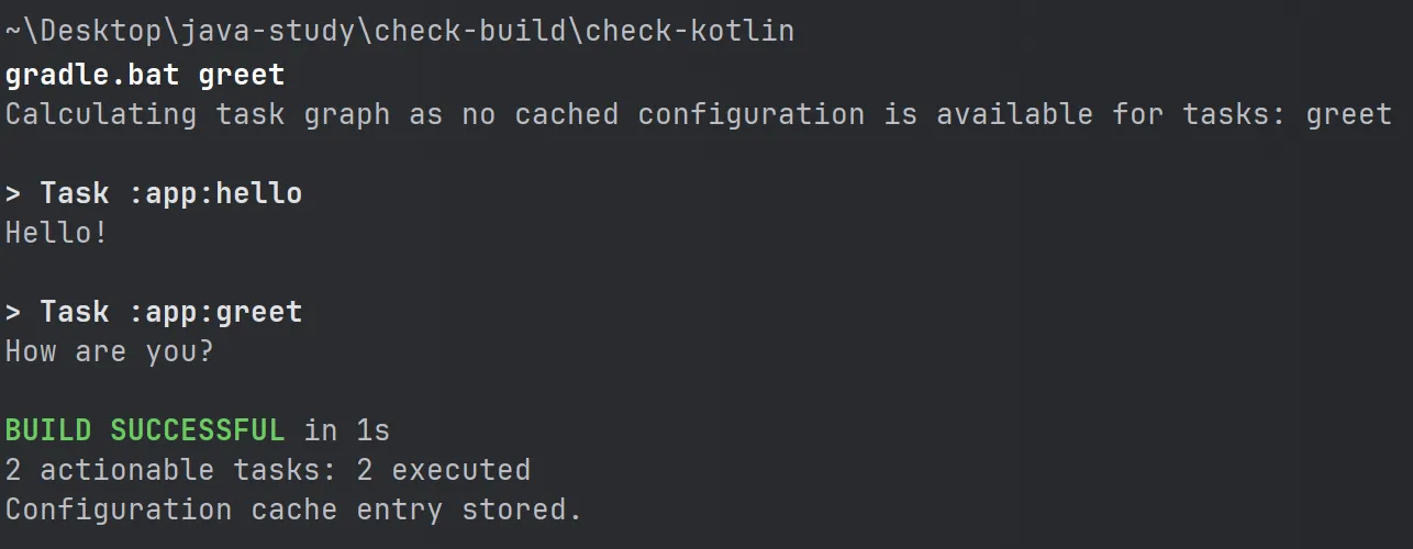 다음과 같이 사용자 task를 정의할 수 있고 gradlew.bat greet 명령을 통해 커스텀 task를 실행할 수 있다.